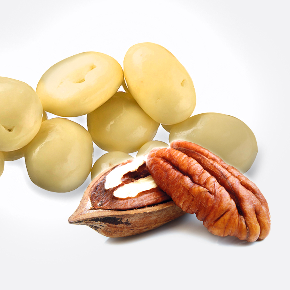 White Chocolate, White Sugar, Cocoa Butter, Whole Milk Podwer, Soy Lecithin, Syrup, Vanilla Extract, Emulsifier, Pecan