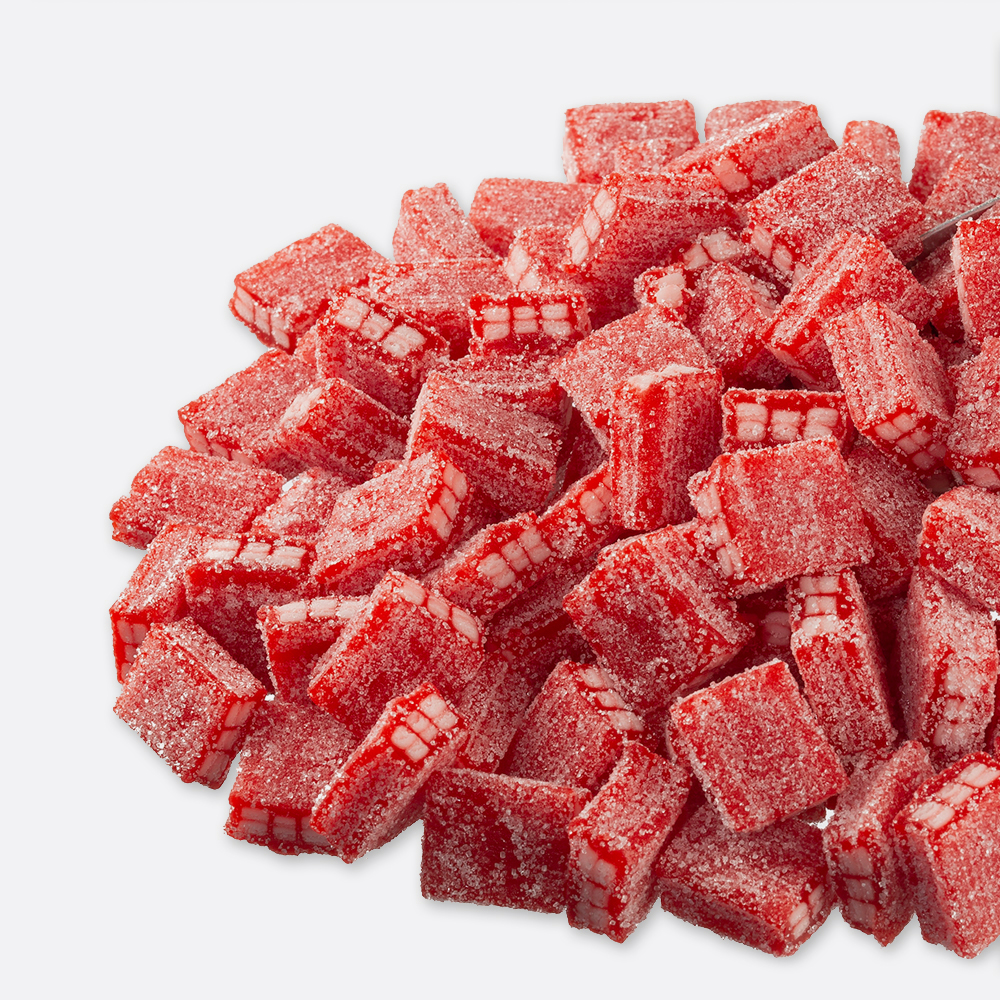 sugar, corn syrup, wheat flour, modified corn starch, malic acid, palm oil, fish gelatin, lactic acid, citric acid, artificial flavors, sodium lactate, trisodium citrate, salt, mono- and di-glycerides, glycerin